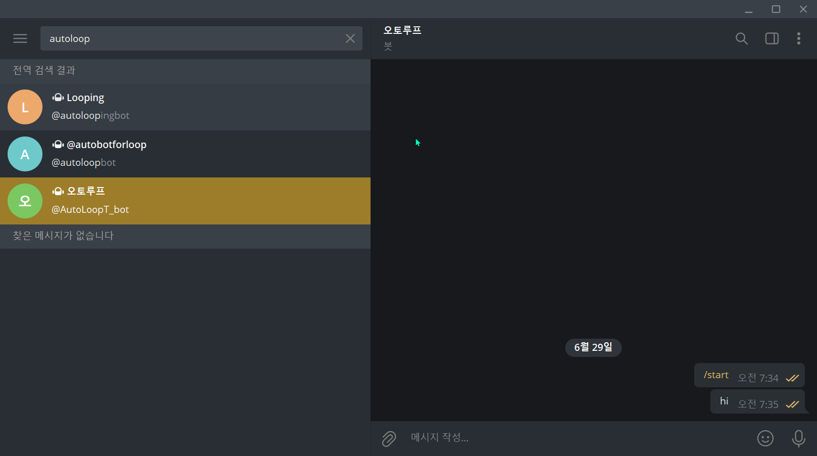 검색창에 봇이름을 검색해보시면 생성되어있습니다.