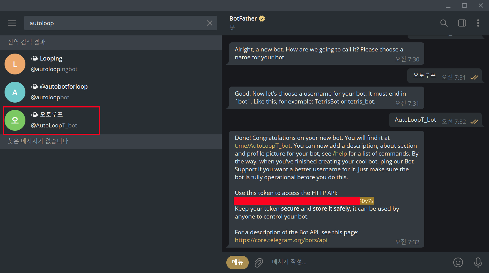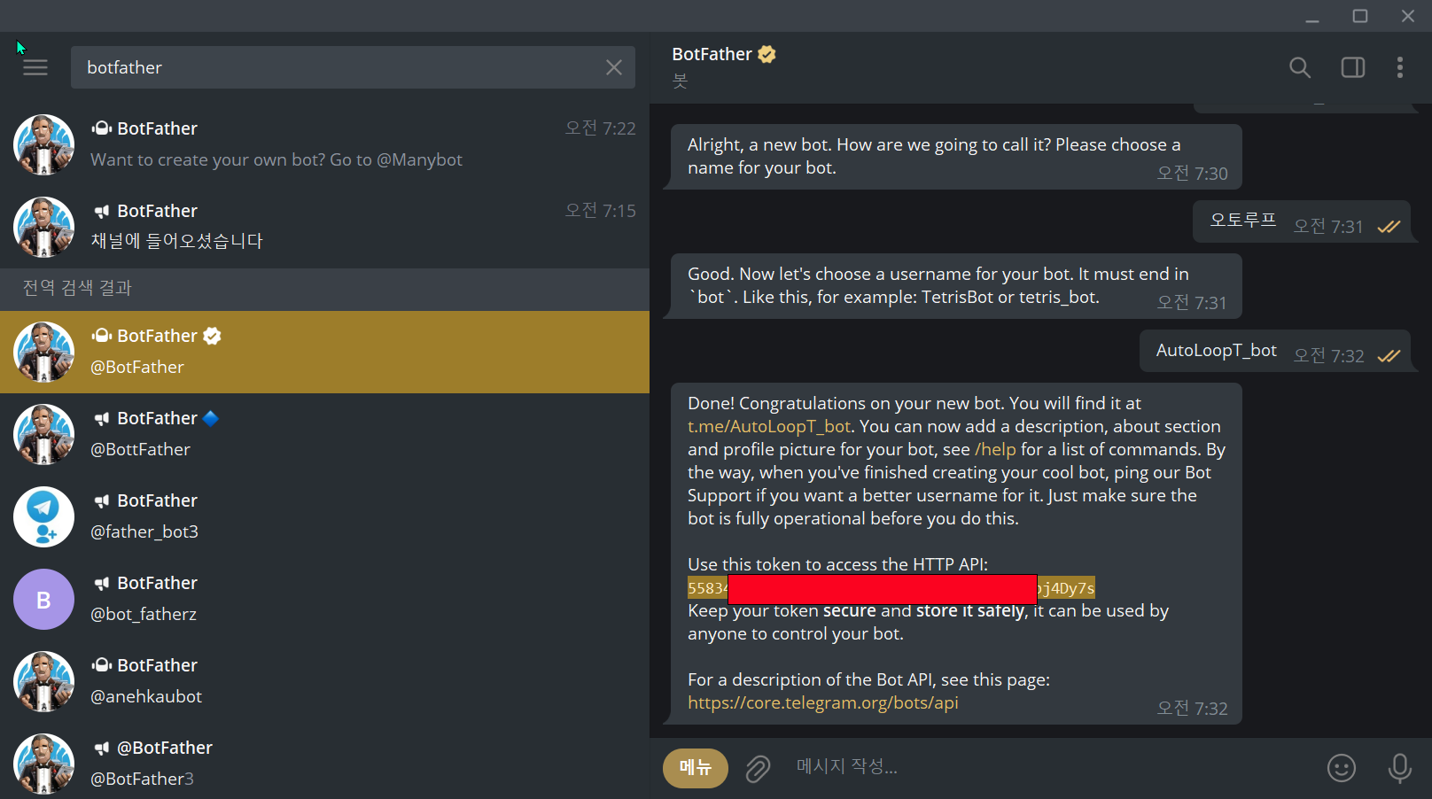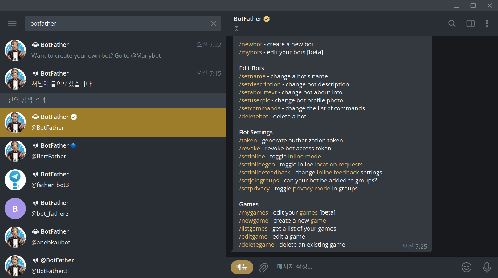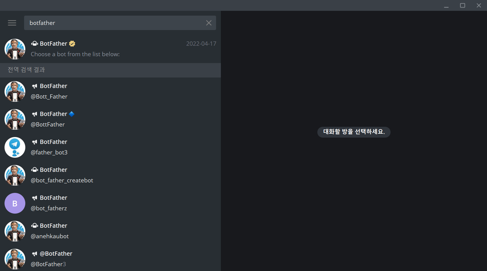 1.텔레그램 실행된 상태에서 상단 검색창에 botfather를 입력합니다.