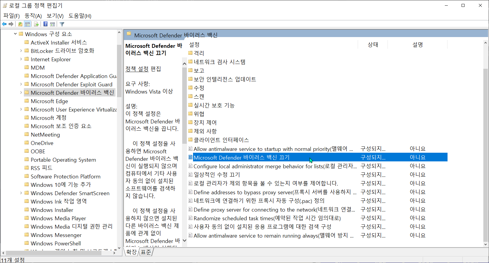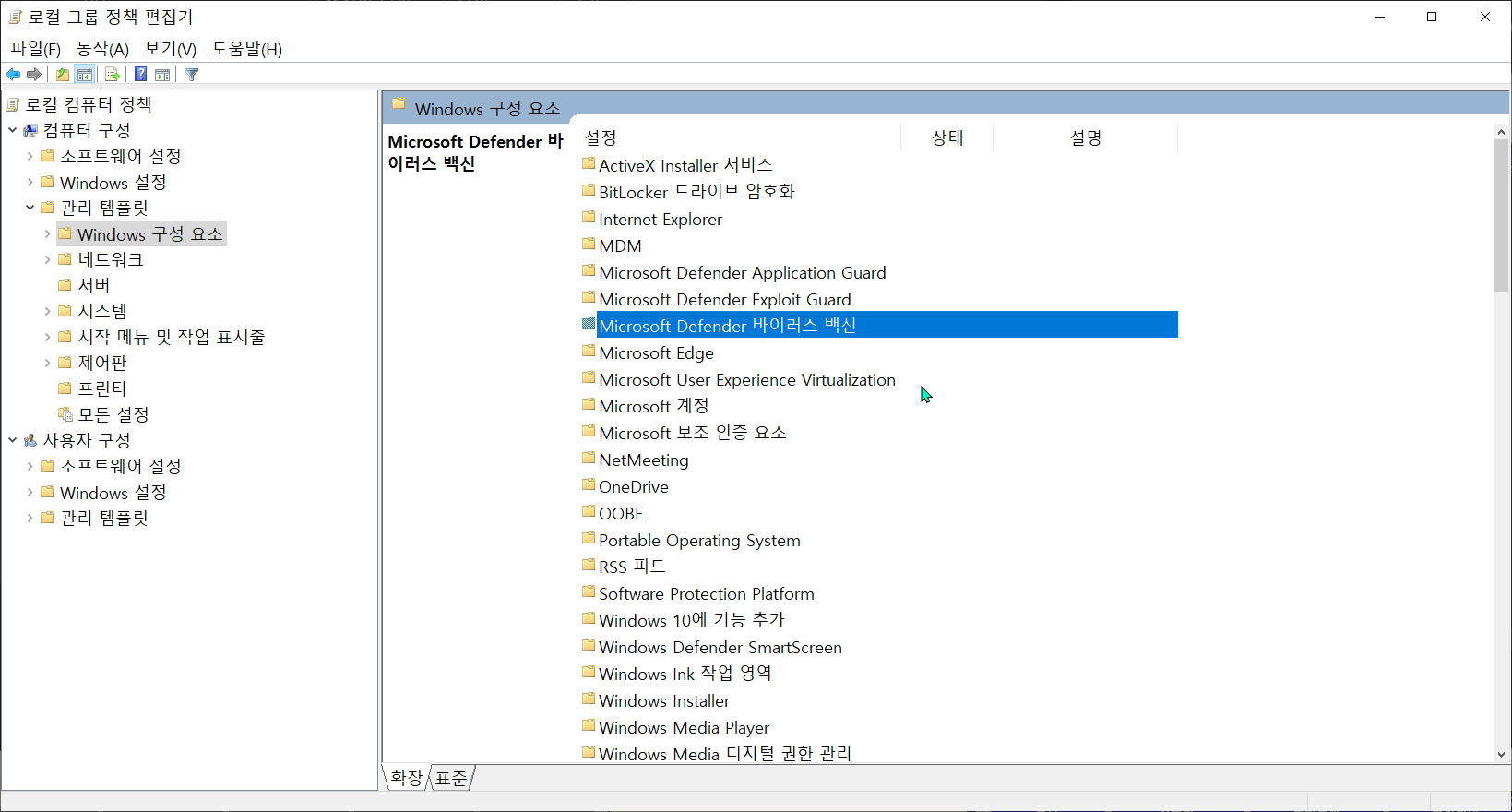 3.Windows 구성요소 선택후 Microsoft Defender 바이러스백신 클릭