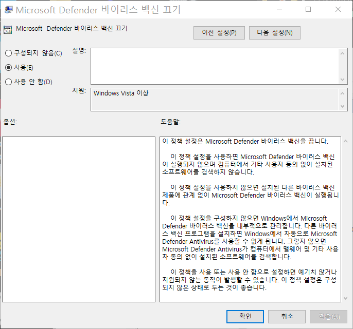 5.Microsoft Defender 바이러스백신 끄기 사용 선택후 확인후 PC 재부팅 완료