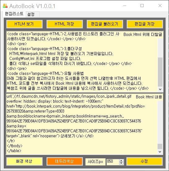 HTML 코드를 전부 복사해서 Book Html 내용에 복사해서 사용하시면 되겠습니다.
