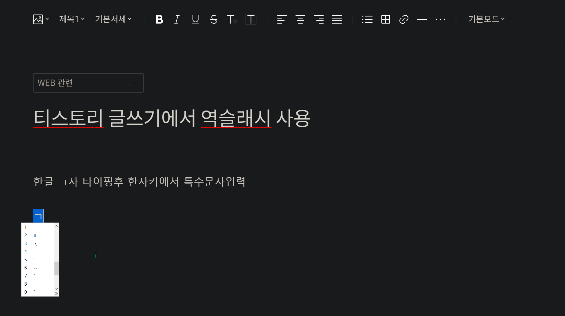 한글 ㄱ자 타이핑후 한자키에서 특수문자입력