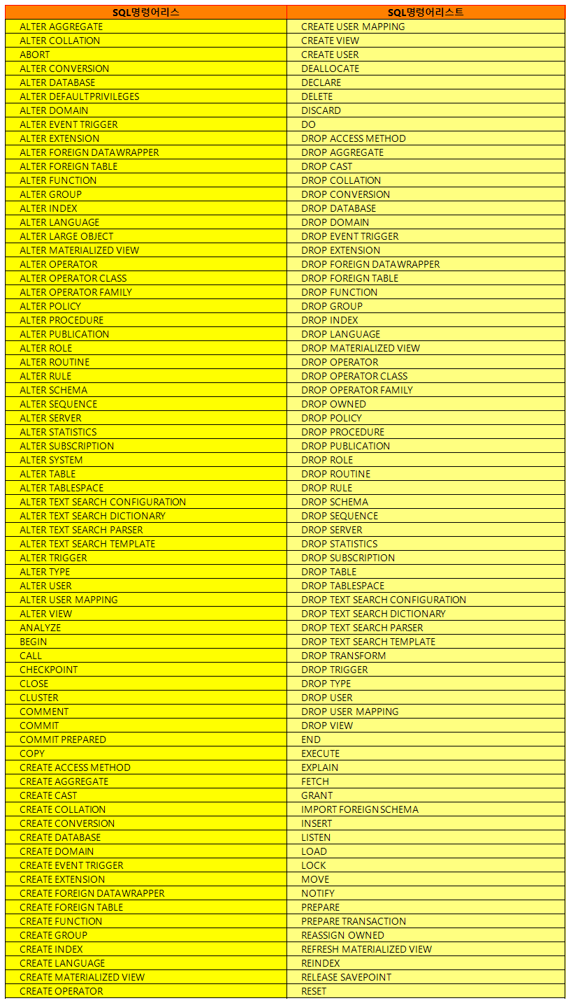 | PostgreSQL SQL 명령어 리스트 (0) | 2020.10.06 |