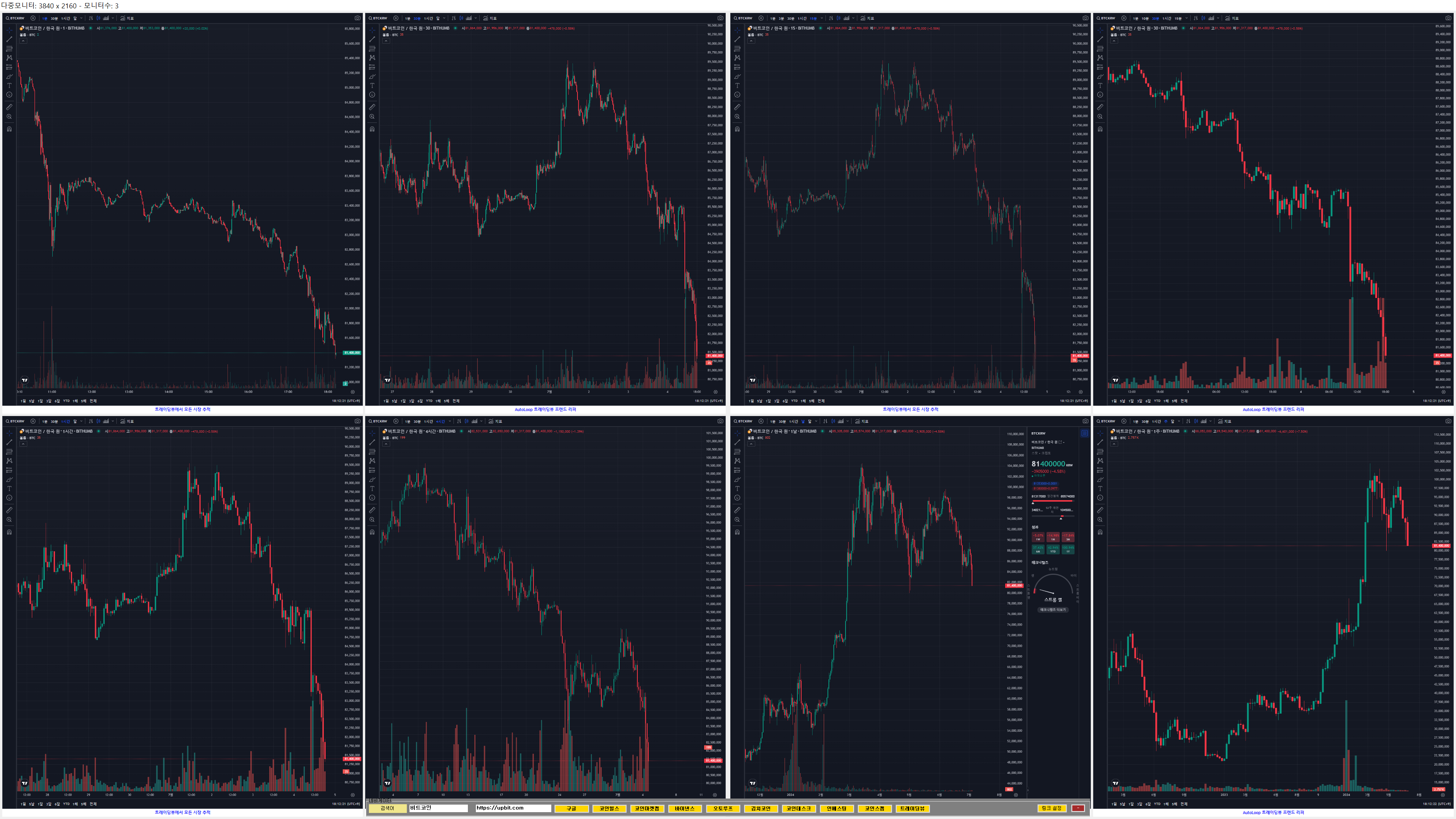 바인낸스 트레이딩뷰 연동 멀티차트 보기입니다. 해상도 3840 * 2160 에서 차트 8개까지 보실수 있습니다.